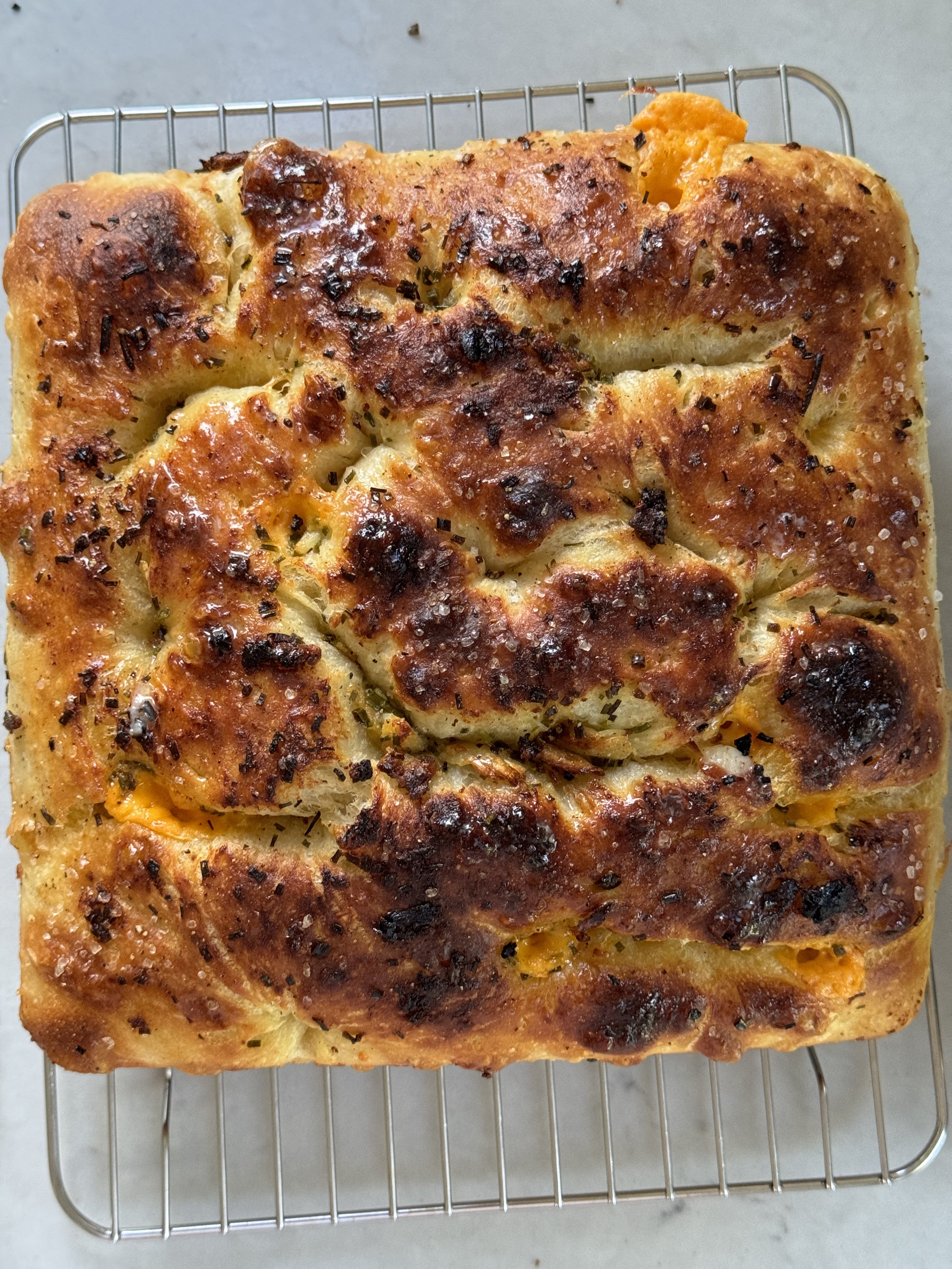 Sourdough starter, 00 flour, water, olive oil, fine sea salt, honey, unsalted butter, fresh garden parsley & chives, oven-roasted garlic, cubed aged orange cheddar.
