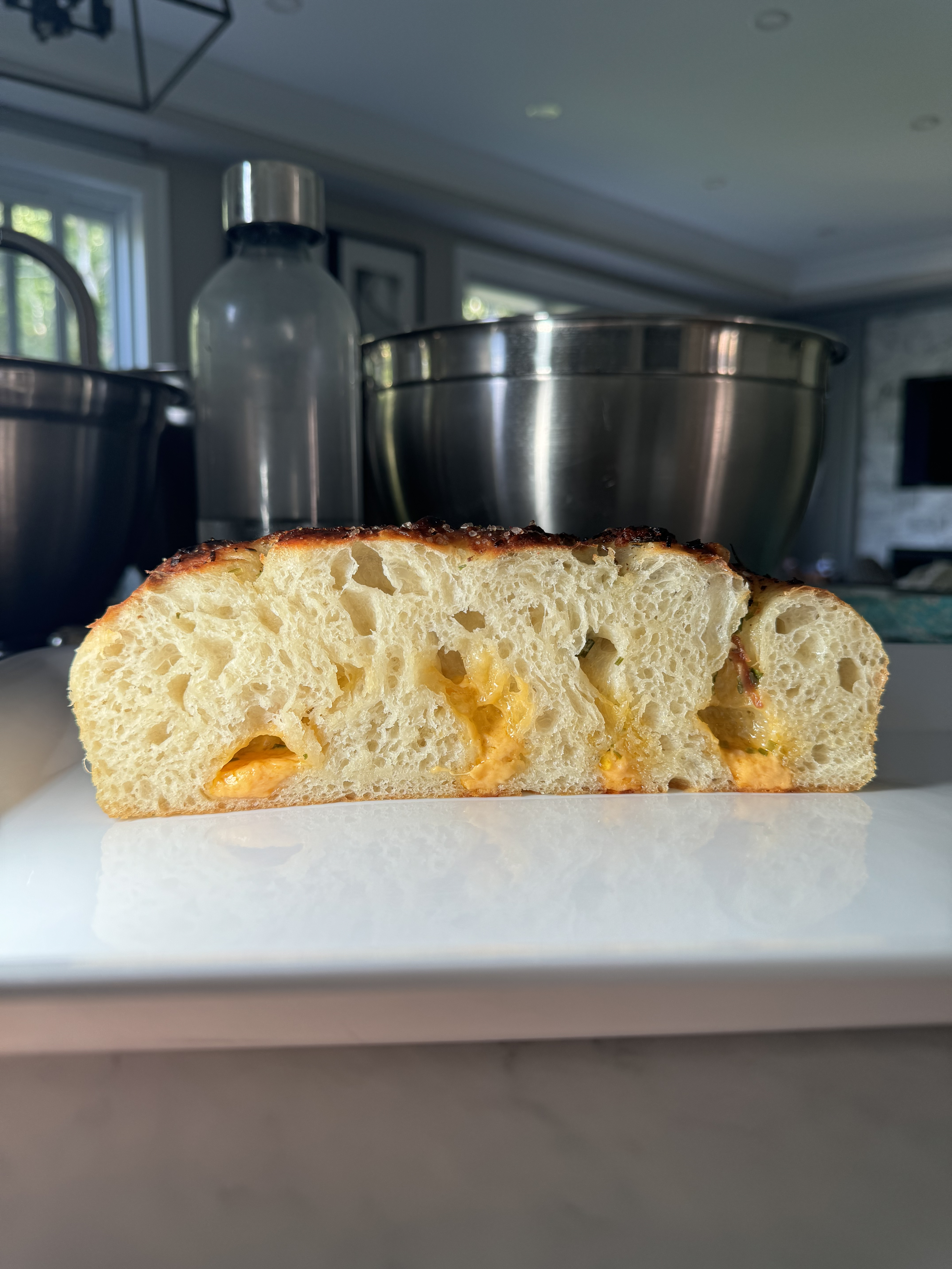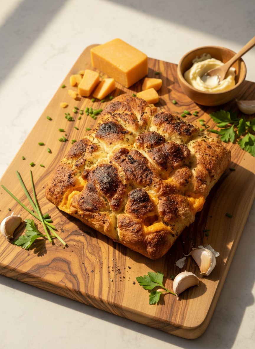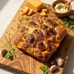 Our ode to garlic bread, reimagined in focaccia form. Roasted garlic, sharp orange cheddar, butter, parsley, and chives are baked into a golden, pull-apart loaf that’s rich, aromatic, and irresistibly melty. Inspired by football season, it’s a flavour-packed centerpiece made for sharing — the kind of bread that belongs on a game-day spread as much as it does at a cozy fall table.