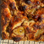 Red wine–poached Ontario pears, steeped with cinnamon and orange peel, bring all the warmth of fall into this loaf. Paired with creamy gorgonzola and finished with a drizzle of balsamic, it’s equal parts sweet, spiced, and savoury.